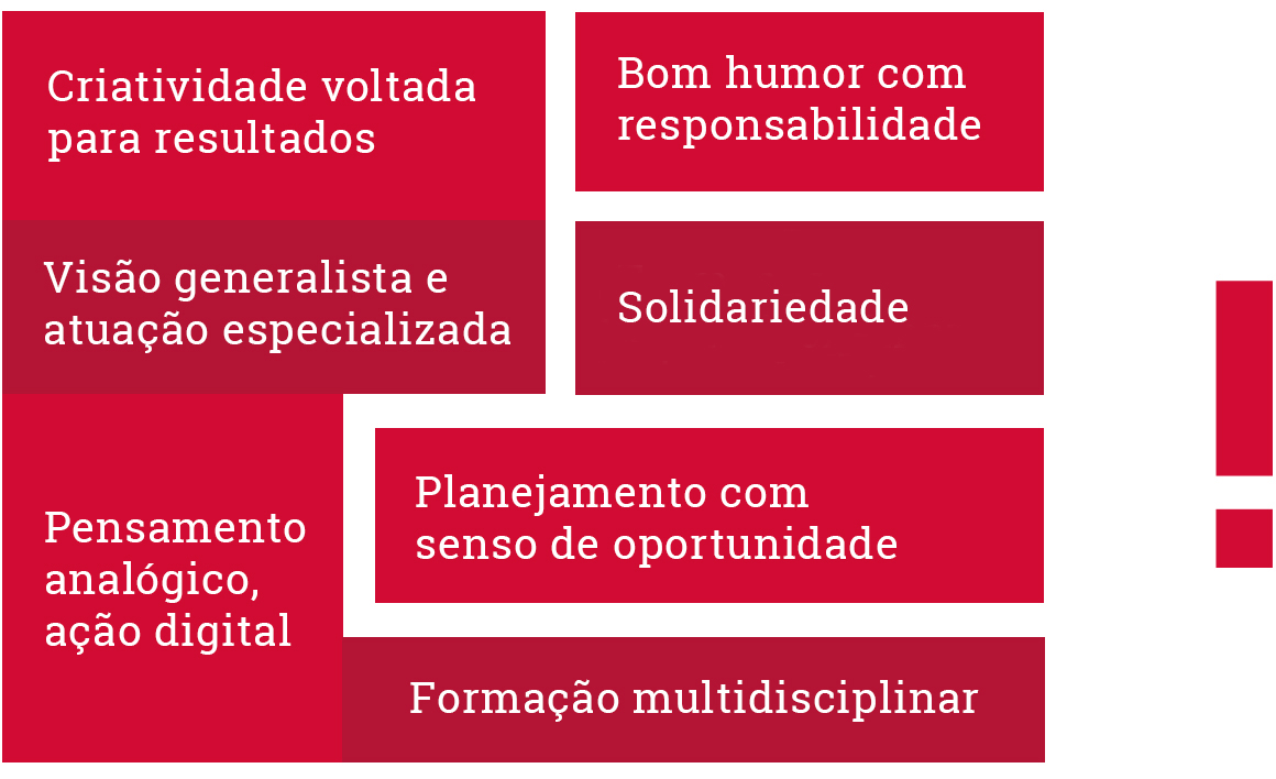 São essas tendências que queremos acompanhar e antecipar sem perder a perspectiva da experiência acumulada no trabalho para grandes marcas como Itaú Unibanco, Infoglobo, Personal Service, Souza Cruz, Vale do Rio Doce, Grupo Oi, Grupo Editorial Record, Editora Objetiva, Knauf do Brasil, Ponto Frio, ICF Internacional, Abifina, além de importantes fundos de pensão como Brasiletros, Braslight, Valia, Nucleos, Telos, Fapes, São Rafael, Fundação Atlântico, entre outros.
